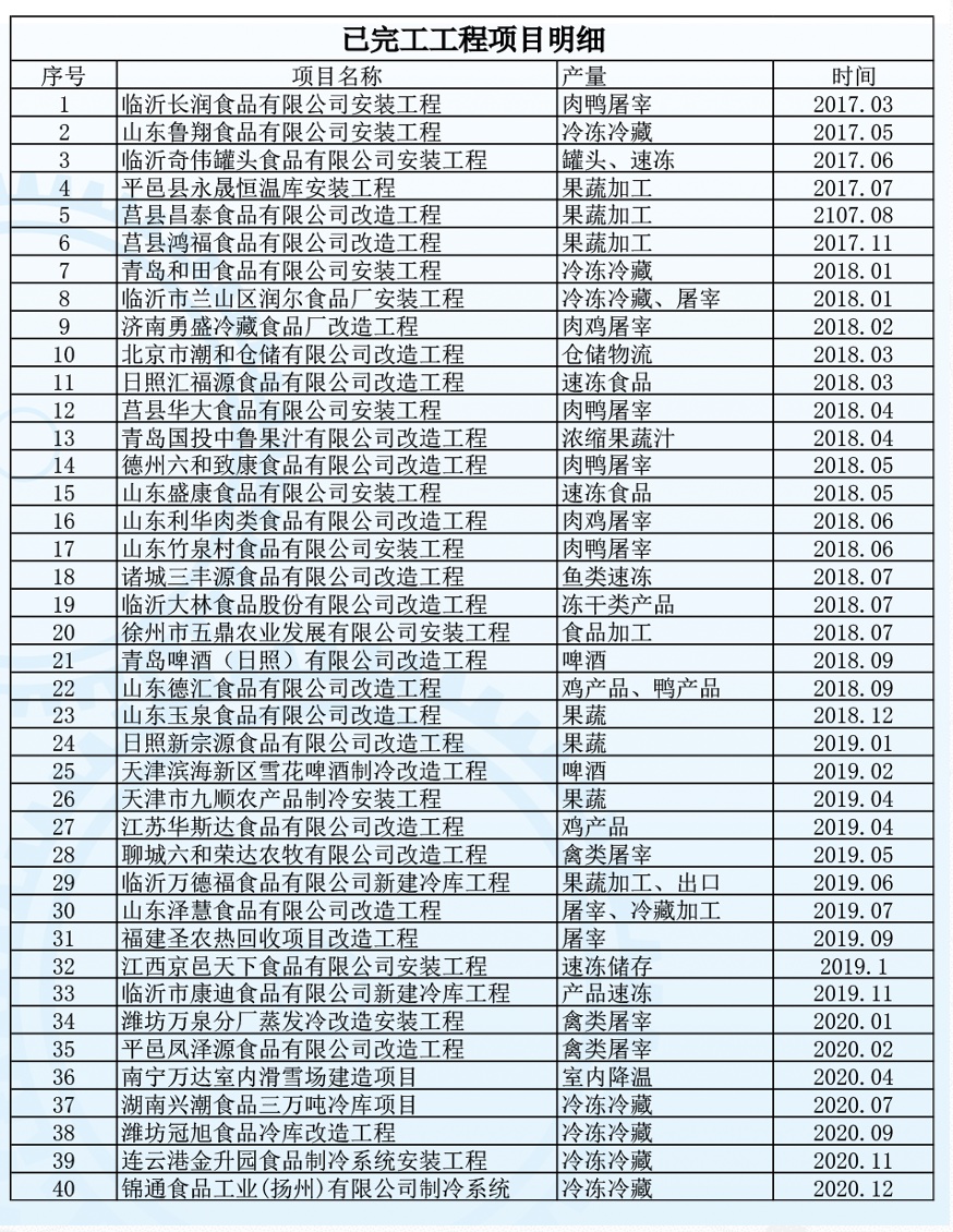 近年來,銀豐制冷經過不斷發展,2018年取得高新技術企業認證資質,先后服務150家企業,其中,新建冷庫60余家,改造冷庫90余家,涉及20多個行業,跨10多個省地區,其中包括:青島啤酒日照有限公司、天津濱海新區雪花啤酒有限公司、齊齊哈爾金鑼肉制品有限公司、湖南興潮食品有限公司、南寧萬達娛雪樂園等制冷系統安裝或者改造工程等。