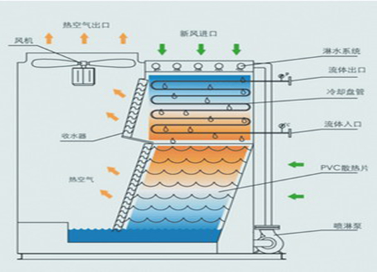 被冷卻水通過盤管與管外噴淋水和空氣進行熱質交換,避免了被冷卻水與空氣直接接觸而導致的水質污染。由于管外有通過PVC填料預冷卻的噴淋水,其換熱效果明顯優于空冷器。如用于冷凍機終端散熱,冷卻塔的盤管和冷凍機的熱交換器連接在一起,形成一個封閉的循環系統,而防止了空氣中的如硫化物氣體、灰塵、微生物等對循環系統的腐蝕,并且冷凍機的熱交換器不會結水垢,免除了冷凍機的除垢保養,使冷凍機節電,運行壽命增長。