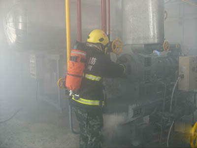 當氨制冷系統發生漏氨事故時,相關人員切不可慌不擇路的選擇自我逃生。當班操作人員要沉著鎮靜,以免亂開或錯開機器設備上的閥門,導致事故進一步擴大。迅速報警,撤離疏散污染區人員至上風處,并立即隔離150M,嚴格限制閑雜人員出入。必須正確判斷情況,組織有經驗的技工進入現場搶救。處理人員必須佩戴正壓式呼吸器,穿防毒服。戴好防護人員進入現場,在水壓防護下處理泄漏點。關閉閥門或加密封等。在整個氨制冷系統中及時發現漏氨部位,做到早發現,早處理。如是高壓管道泄漏,應立即停止壓縮機運行,切斷漏氨部位與系統連通的管道。若管道不長,可采用放空的辦法,待管內余氨放完,并置換后進行補焊。如低壓管道(如冷庫內冷卻設備)漏氨,應迅速查明漏點,關閉其供液閥。由于庫房氨汽甚濃,可開風機排除,并用酸酸溶液噴霧中和。若條件允許,可啟動壓縮機將該冷卻設備內氨液抽回。操作人員可根據制冷系統不同特點和具體情況,采取靈活、安全、有效的處理方法。